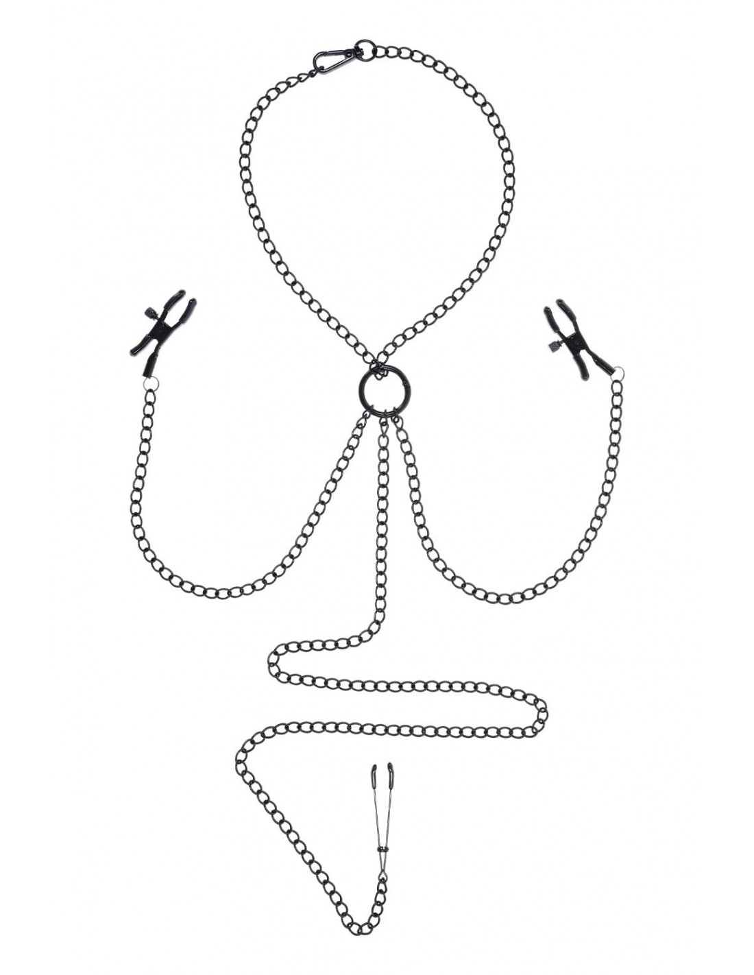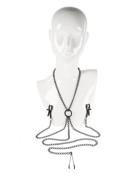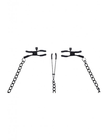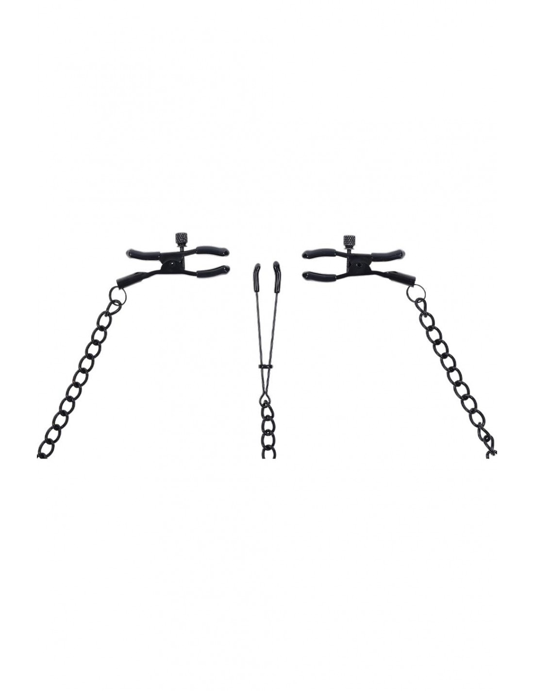 Allumez vos passions et portez l'intimité à de nouveaux sommets sensationnels avec l'ensemble téton à clitoris Saffron. Parfaitement conçu pour une utilisation à l'intérieur et à l'extérieur de la chambre, sentez les illustres chaînes noires draper votre corps à partir du collier de chaîne connecté. Taquinez-vous avec des pinces à tétons attachées pour ajouter de la pression et de l'excitation à vos zones les plus sensibles tandis qu'une troisième pince à épiler s'étend jusqu'à votre clitoris pour une tension séduisante et alléchante. Parfait pour créer des expériences accrues pendant le jeu de sensations ou comme un rappel ludique de votre lieu de soumission car il est porté sous vos vêtements. Sûr et confortable, l'ensemble téton à clitoris vous permet de maîtriser votre plaisir comme vous le souhaitez, car ils tirent et taquinent à chaque mouvement. Deux pinces à tétons réglables et une pince à clitoris à pince pour une tension précise. Embouts caoutchoutés pour plus de confort et un glissement réduit. Le collier de chaîne se connecte aux pinces à tétons et à clitoris avec un joint torique central. Collier amovible pour un port discret. Matériau : fer/PVC/alliage de zinc.