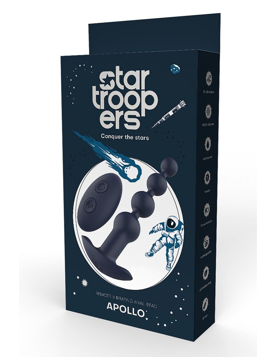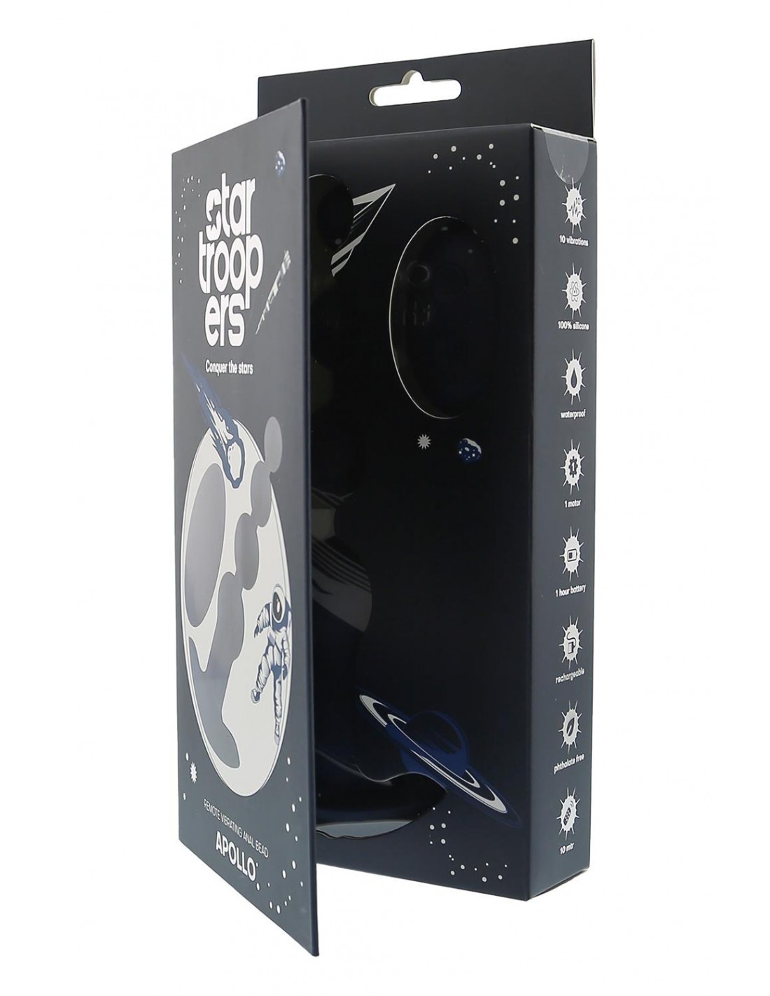 Apollo a une forme perlée, 7 rythmes de vibration et 3 vitesses. Cela garantit un plaisir profond à tous ceux qui aiment la stimulation anale. Le vibromasseur à perles anales flexibles de la gamme Startroopers est livré avec une télécommande pour une utilisation facile des 7 rythmes de vibration et des 3 vitesses avec 2 boutons. Vous pouvez également utiliser le bouton unique du vibromasseur. Après une charge complète, le vibromasseur à perles Startroopers est prêt pour 60 minutes de stimulation. Il est résistant à l'eau IPX6, dispose d'un trou de chargement étanche et un câble de chargement à broche USB est inclus. La télécommande n'est pas étanche. Il comprend une pile CR2032. Apollo est sans danger pour le corps et sans phtalates. Il est fait de silicone doux et lisse et d'ABS. Perles anales vibrantes avec télécommande sans fil 1 moteur 10 vibrations : 7 rythmes, 3 vitesses Fonctionnement à un seul bouton sur le vibrateur Fonctionnement à 2 boutons avec télécommande Rechargeable, câble USB inclus Temps de charge 90 minutes Durée de fonctionnement 60 minutes Résistance à l'eau IPX6 (vibromasseur) La télécommande contient une pile CR2032, non étanche Fabriqué en silicone et ABS Sans danger pour le corps, sans phtalate