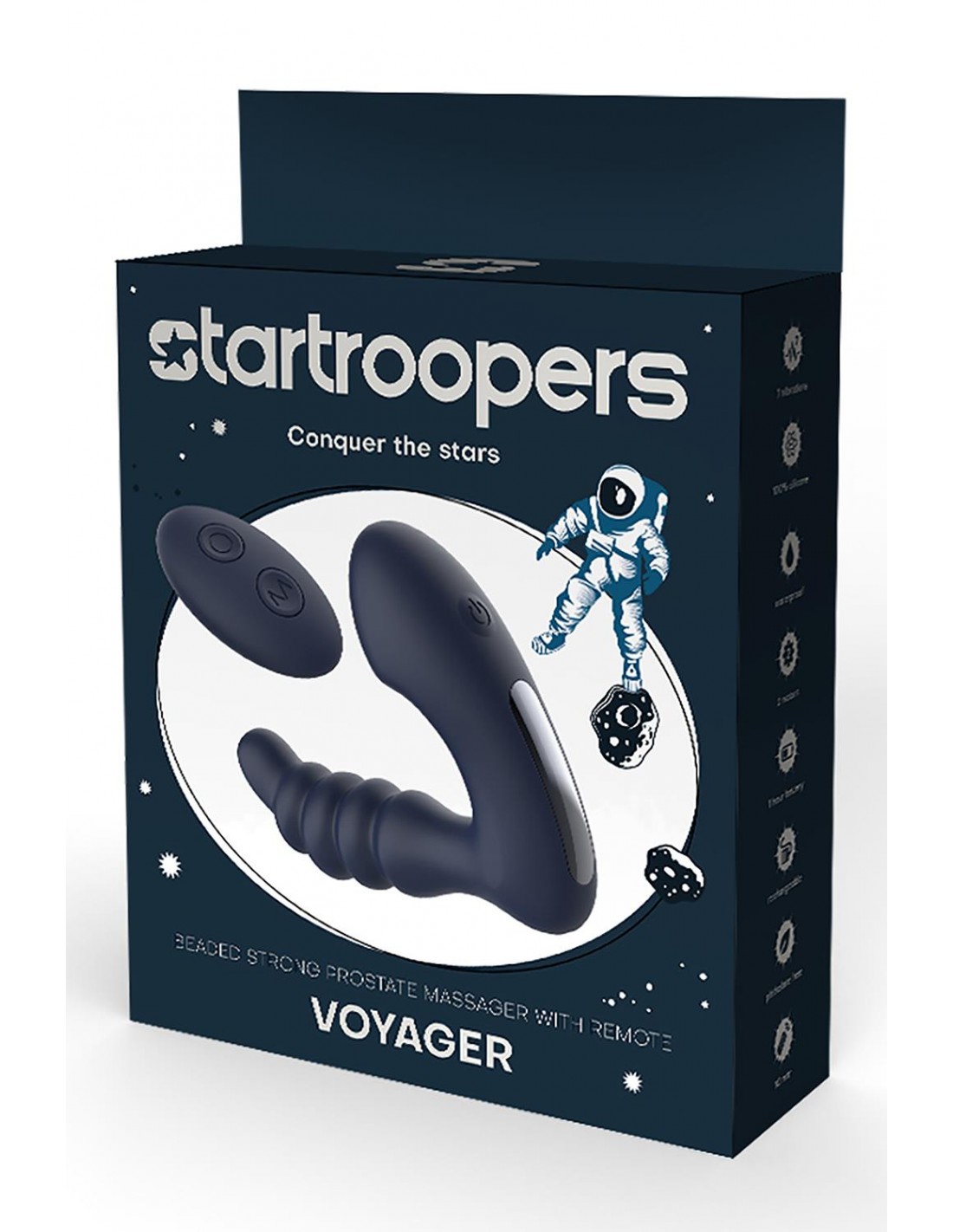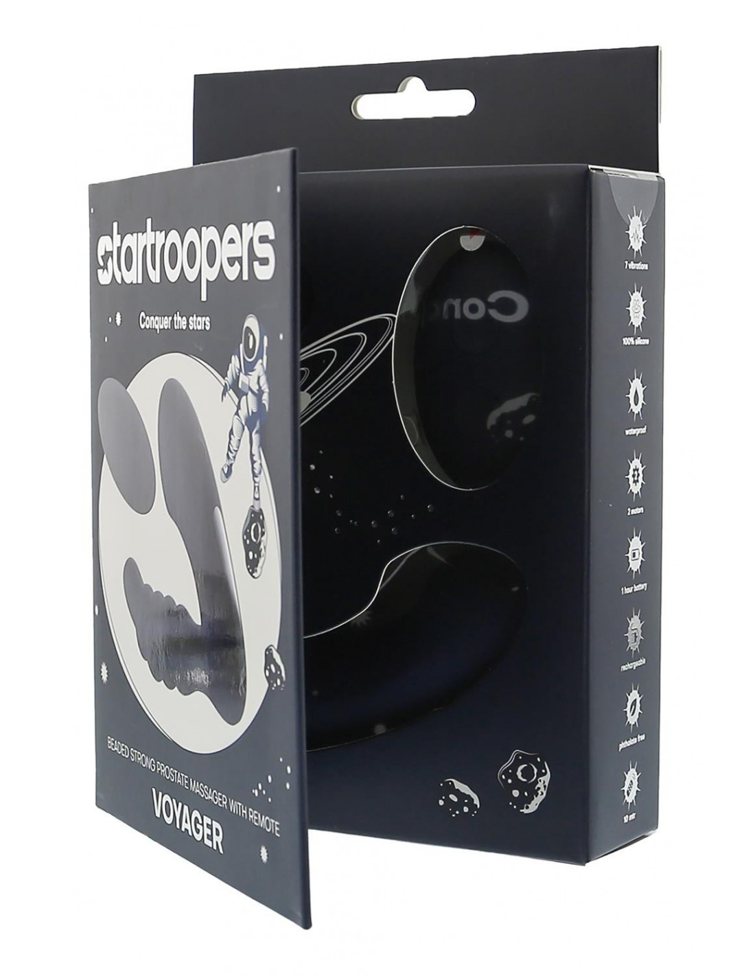 Montez à bord et profitez du voyage ! Voyager vous offre une double stimulation avec de fortes vibrations pour la stimulation anale et prostatique. Le masseur de prostate perlé de la gamme Startroopers possède 4 rythmes et 3 vitesses qui peuvent être facilement actionnés avec la télécommande à 2 boutons. Ou utilisez simplement le bouton unique du masseur pour changer les vibrations. Le Voyager n'a besoin d'être rechargé qu'avec le câble USB magnétique inclus pour être prêt à décoller à nouveau, prêt pour votre prochain voyage de 60 minutes vers le plaisir suprême du point P. Il est résistant à l'eau (IPX6) et sans danger pour le corps. Fabriqué en ABS et en silicone souple et lisse sans phtalates. La télécommande comprend une pile CR2032 et n'est pas étanche. Masseur de prostate puissant à perles avec télécommande sans fil 1 moteur 7 vibrations : 4 rythmes, 3 vitesses Fonctionnement à un seul bouton sur le masseur Fonctionnement à 2 boutons avec télécommande Câble USB magnétique rechargeable inclus Temps de charge 90 minutes Durée de fonctionnement 60 minutes Résistance à l'eau IPX6 (masseur) La télécommande contient une pile CR2032, non étanche Fabriqué en silicone et ABS Sans danger pour le corps, sans phtalate