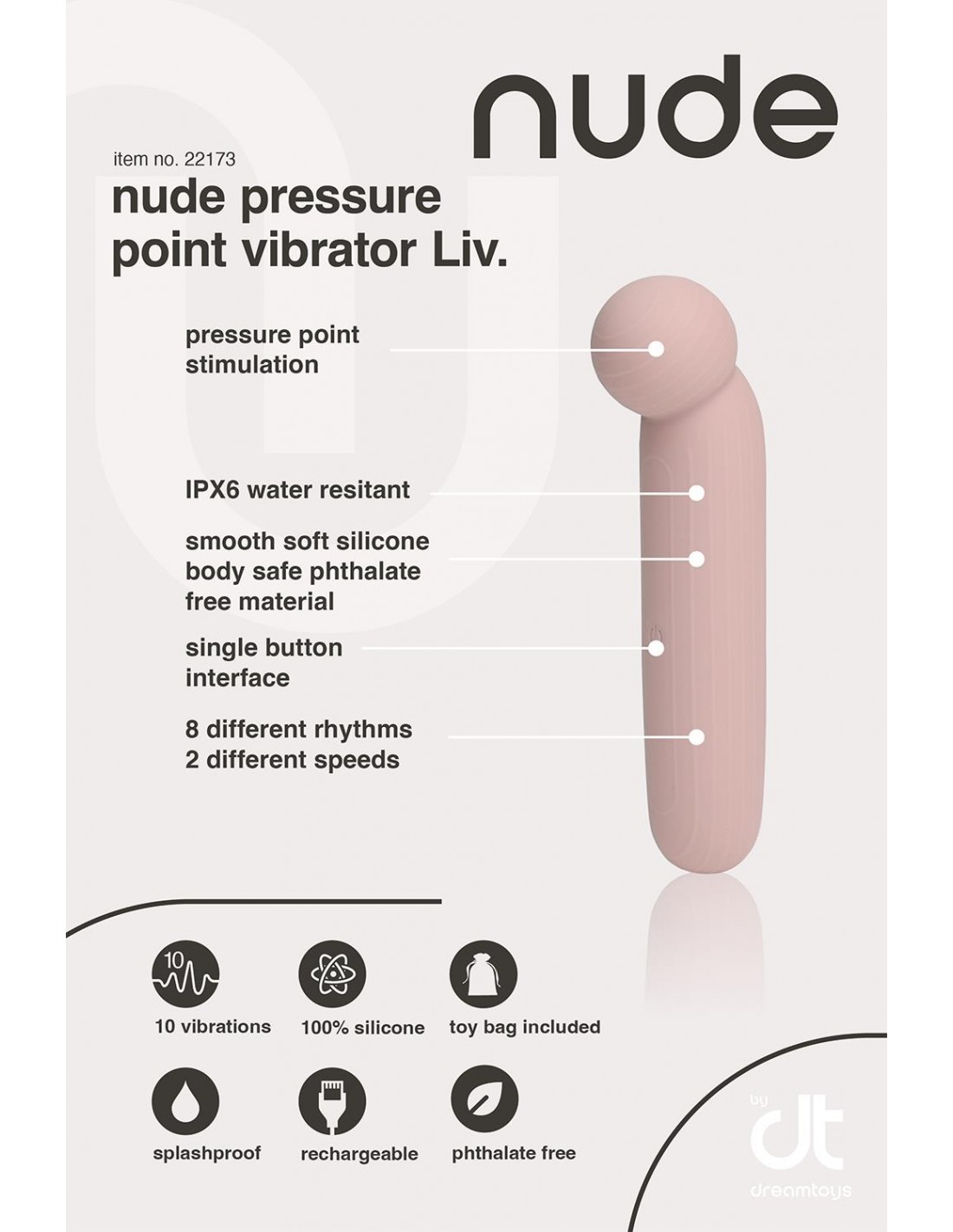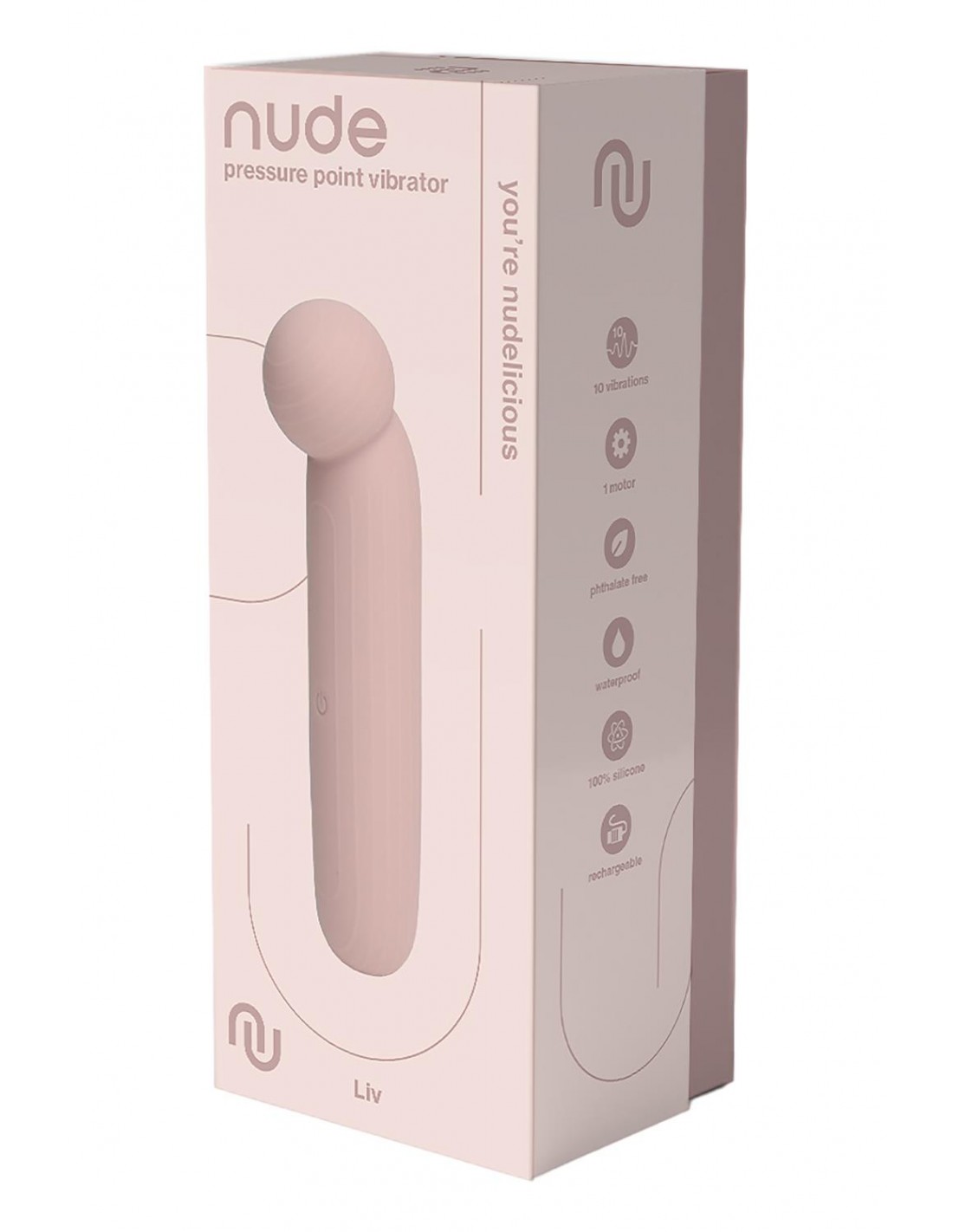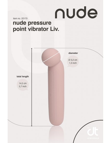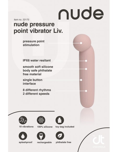 Le vibromasseur Liv sophistiqué peut emmener les utilisateurs dans un monde de plaisir. Le vibromasseur à point de pression flexible dans une douce teinte rose poudré plaira lors d'une utilisation en solo et peut être le favori d'un couple. La taille de voyage fait de Liv un jouet parfait à emporter en voyage et en vacances. Il se glisse dans n'importe quel sac à main ou valise avec sa longueur de 14,5 cm. Avec une forme de boule polyvalente sur le dessus et un design flexible, Liv est le compagnon idéal pour une stimulation précise avec une pression variable et des massages luxueux. Équipé d'un bouton de commande unique stratégiquement placé au milieu de la tige facile à saisir, Liv guide sans effort les utilisateurs à travers 10 vibrations puissantes, comprenant 8 motifs rythmiques et 2 vitesses revigorantes. Conçu sur mesure pour les débutants et ceux qui aspirent à une stimulation par points de pression, Liv élève leurs expériences intimes vers de nouveaux sommets. La magie de Liv peut être expérimentée pendant 50 minutes après chaque charge, et elle peut se fondre parfaitement dans une routine de soins personnels. L'indice d'étanchéité IPX6 de Liv le rend résistant aux éclaboussures pour un plaisir sans souci. Le trou de chargement étanche et le câble USB inclus garantissent une commodité à chaque instant. Fabriqué en silicone souple et ABS, sans phtalate et sans danger pour le corps, Liv montre notre engagement envers le bien-être. Liv by Nude – où la flexibilité rencontre la précision et où le plaisir ne connaît pas de limites. Vibromasseur à point de pression flexibleTaille de voyage 10 Vibrations puissantes : 8 rythmes et 2 vitesses Fonctionnement à un seul bouton Parfait pour les débutants Trou de chargement étanche Câble USB inclus Autonomie après une charge complète : 50 minutes IPX6 Résistant aux éclaboussures Fabriqué en silicone souple et ABS, sans phtalate et sans danger pour le corps