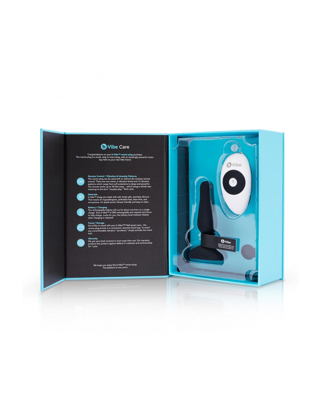 b-Vibe Novice Plug - plug télécommandé ultra puissant et adapté aux débutants. Comprend : Novice Plug Télécommande Sac de voyage et de rangement Cordon USB Guide de l'utilisateur Guide du jeu anal Le Novice est un petit plug facile à insérer, avec un moteur incroyablement puissant. Ce plug en silicone compact, certifié sans danger pour le corps, sans couture, offre 6 niveaux de vibration et 15 modes de vibration pour une multitude de combinaisons érotiques. À utiliser avec ou sans la télécommande sans fil qui non seulement facilite l'utilisation mais offre également diverses possibilités de jeu en couple. Type d'utilisateur : petit Taille insérable : 3,35" / 8,5 cm Diamètre : 1" / 2,5 cm Circonférence : 3" / 8 cm Sensations : vibration Moteurs : 1 Matériau : silicone sans couture b-Vibe : Produits de jeu anal haut de gamme pour tous les couples b-Vibe est une collection haut de gamme de produits de jeu anal à la pointe de la technologie fondée par l'éducatrice sexuelle certifiée, Alicia Sinclair. Fruit d'années de recherche, chaque produit b-Vibe utilise des tactiques de conception innovantes pour répondre à des sources spécifiques, souvent non traitées, de plaisir anal. Pionnier dans la catégorie des accessoires anaux haut de gamme, b-Vibe a su donner le ton de la qualité, mais accessible, pour une catégorie en pleine émergence. Plus particulièrement, la mission principale de b-Vibe est de favoriser l'exploration par l'éducation. En proposant une gamme constante de contenus accessibles, de guides soigneusement rédigés et d'informations concrètes, la marque favorise l'inclusion et le jeu informé. Tous les produits b-Vibe sont 100 % sans danger pour le corps, conformément à la proposition 65 de Californie (sans phtalates) et aux certifications mondiales CE et REACH. Chaque plug est livré avec une garantie et des livrets d'instructions pour rendre l'expérience plus sûre, plus informée et, en fin de compte, plus agréable.
