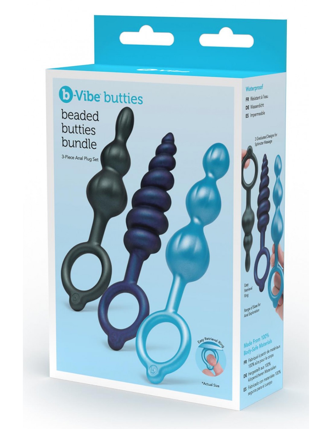 Ensemble de 3 plugs anaux Beaded Butties Bundle. Évaluez votre stimulation avec le pack Beaded Butties de b-Vibe. Cet ensemble de trois plugs gradués vous permet de plonger dans le plaisir avec des perles augmentant progressivement qui massent votre sphincter à chaque poussée. Les trois tailles de plugs vous permettent d'augmenter ou de diminuer la taille pour l'entraînement anal, et la variété de textures offre trois styles de stimulation excitants différents. Les trois plugs sont 100 % étanches pour une utilisation dans le bain ou la douche et permettent un nettoyage facile. La collection Butties de b-Vibe propose une gamme de plugs en silicone 100 % sans danger pour le corps, parfaits pour explorer le plaisir postérieur. Compatible avec tous les lubrifiants à base d'eau, cette collection douce et soyeuse comble les envies de votre keister avec des designs qui massent votre sphincter, piquent votre prostate (si vous en avez une) et procurent cette sensation de plénitude convoitée pour une expérience anale bien équilibrée. Chaque jouet de la collection est doté d'une base évasée et d'un anneau de la taille d'un doigt pour un retrait et une récupération faciles. Rencontrez vos nouveaux amis avec les avantages de la collection b-Vibe Butties.