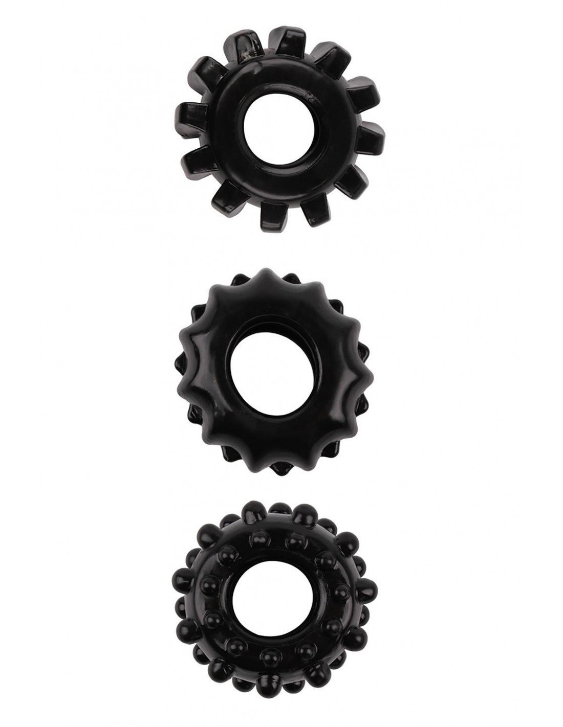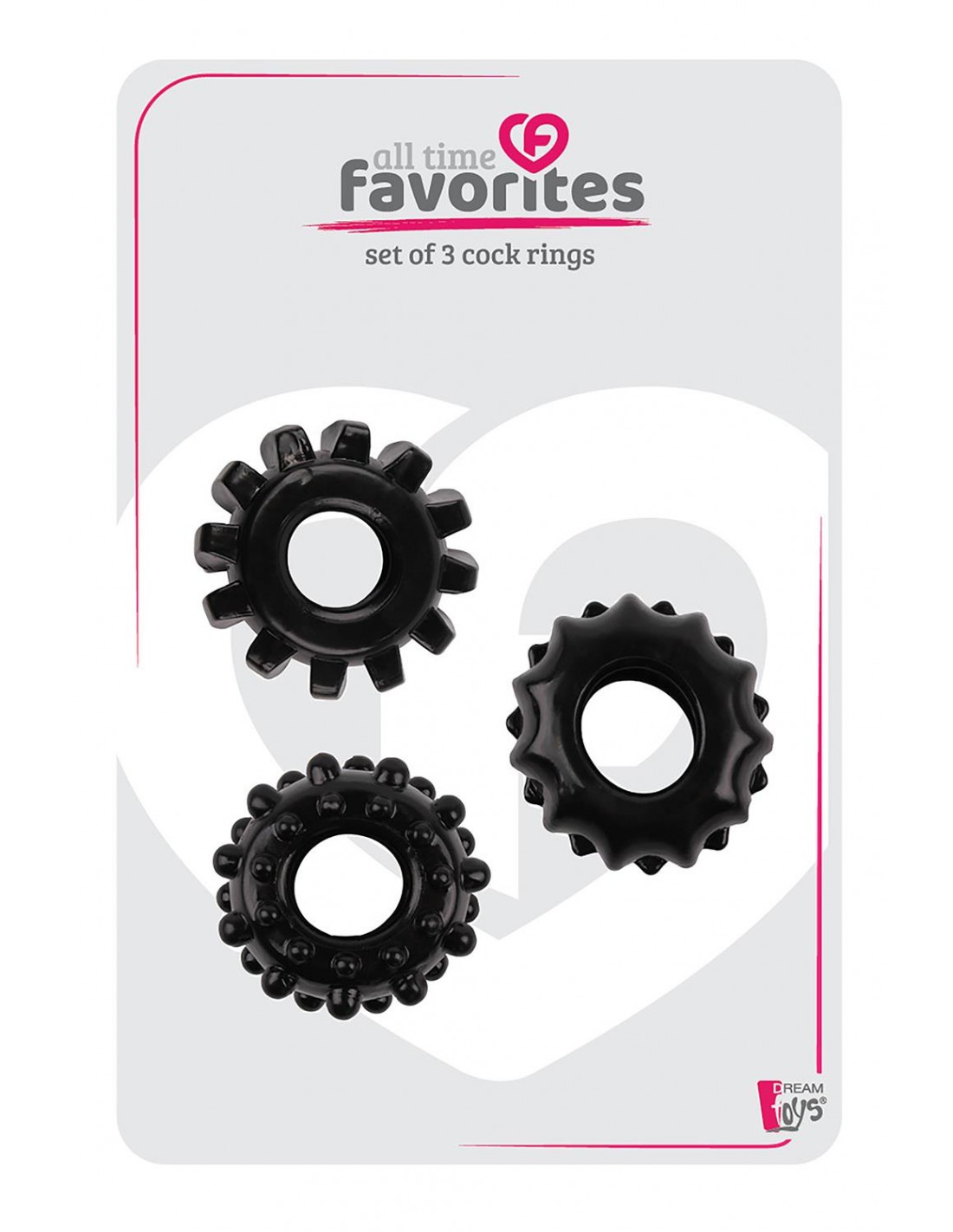 Ce lot de 3 anneaux péniens du label All Time Favorites présente 3 textures différentes. Ils sont extensibles et grâce à leur ajustement serré, ils assurent des érections dures et durables, tandis que la texture la stimule pendant les rapports sexuels. Ensemble de 3 anneaux péniens. Différentes textures. Extensible. Ajustement serré.