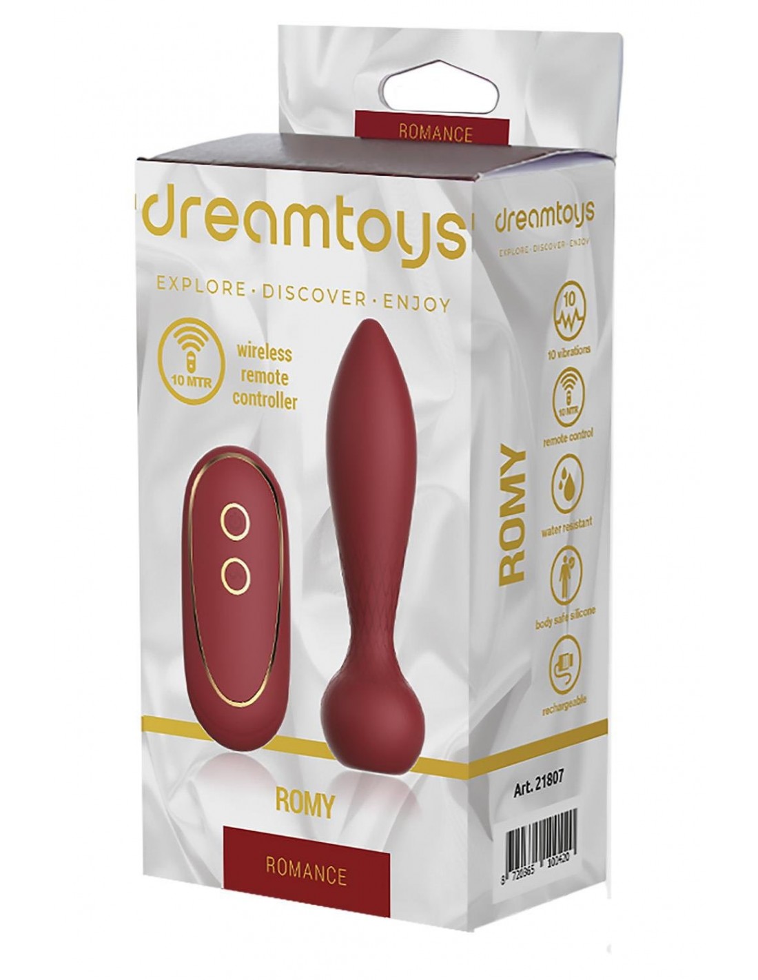 Depuis le lancement de la collection Romance de Dream Toys, nous avons bénéficié d'un grand intérêt pour la gamme de jouets de la part de nos clients et de leurs clients, les utilisateurs. La collection Romance se caractérise par une couleur rouge bordeaux avec des accents dorés qui donnent aux jouets un aspect élégant. À l'intérieur, ils disposent d'une technologie de haute qualité offrant une stimulation intense avec 7 rythmes de vibration et 3 vitesses. La facilité d'utilisation est également importante, c'est pourquoi ils sont tous étanches et rechargeables. Ce vibromasseur anal Romance doté d'une télécommande sans fil s'appelle Romy. La boîte a le style typique de Romance : un fond de satin blanc, des accents de couleur dorée, des images claires du jouet, une description multilingue au dos, des icônes pour un aperçu rapide des fonctions et les dimensions sur le panneau latéral de la boîte.Vibrateur anal avec télécommande2 moteurs puissants3 vitesses et 7 fonctions de pulsationFortes vibrations profondesLe vibrateur et la télécommande sont rechargeablesCâble à broche USB inclusÉtanche IPX7Cliquez ici pour télécharger le manuel