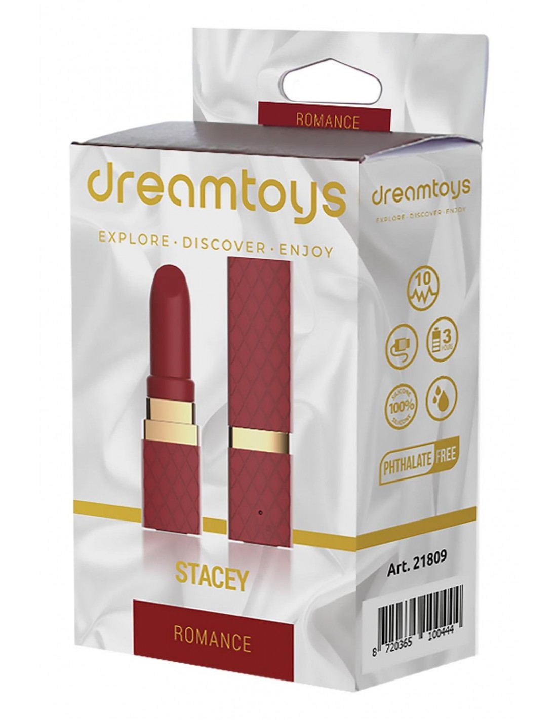 Depuis le lancement de la collection Romance de Dream Toys, nous avons bénéficié d'un grand intérêt pour la gamme de jouets de la part de nos clients et de leurs clients, les utilisateurs. La collection Romance se caractérise par une couleur rouge bordeaux avec des accents dorés qui donnent aux jouets un aspect élégant. À l'intérieur, ils disposent d'une technologie de haute qualité offrant une stimulation intense avec 7 rythmes de vibration et 3 vitesses. La facilité d'utilisation est également importante, c'est pourquoi ils sont tous étanches et rechargeables. Ce vibromasseur en forme de rouge à lèvres Romance possède un capuchon hygiénique et s'appelle Stacey. La boîte a le style typique de Romance : un fond de satin blanc, des accents de couleur dorée, des images claires du jouet, une description multilingue au dos, des icônes pour un aperçu rapide des fonctions et les dimensions sur le panneau latéral de la boîte.1 Moteur puissant3 vitesses, 7 fonctions pulsées Forte vibration profondeÉtanche IPX7RechargeableCâble de recharge inclusCliquez ici pour télécharger le manuel