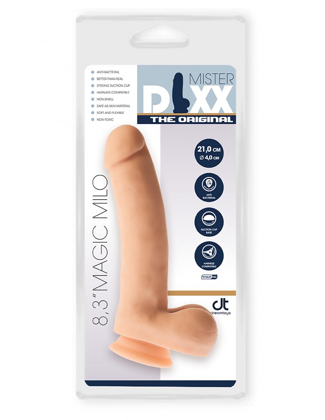 Magic Milo de la collection Mr Dixx - The Original est un gode doux et flexible, fabriqué en PVC antibactérien, sans odeur et sans danger pour le corps. Milo ressemble à un vrai gode et dispose d'une forte ventouse permettant aux utilisateurs de profiter d'une gamme de possibilités pour toutes sortes de plaisirs, en solo ou avec un partenaire. La base à ventouse garantit que Milo adhère à toute surface lisse et plane, qu'il s'agisse du sol, de la tête de lit ou de la paroi de la douche. Grâce à la ventouse, le gode peut également être utilisé avec un harnais, en s'assurant qu'il reste bien en place lorsqu'il est passé à travers le joint torique afin que le porteur puisse profiter de ce Mr Dixx sans aucun souci. Magic Milo a une tige légèrement incurvée, d'une longueur et d'une largeur moyennes. Avec sa tige et sa tête de pénis réalistes, il peut stimuler le vagin, le point G, l'anus et le point P. Magic Milo est un gode polyvalent qui exercera sa magie à chaque utilisation. Gode flexible au toucher réaliste Ventouse puissante Compatible avec le harnais Fabriqué en PVC antibactérien Sans phtalates ni latex, sans odeur, sans danger pour le corps Longueur 21 cm Largeur 4 cm