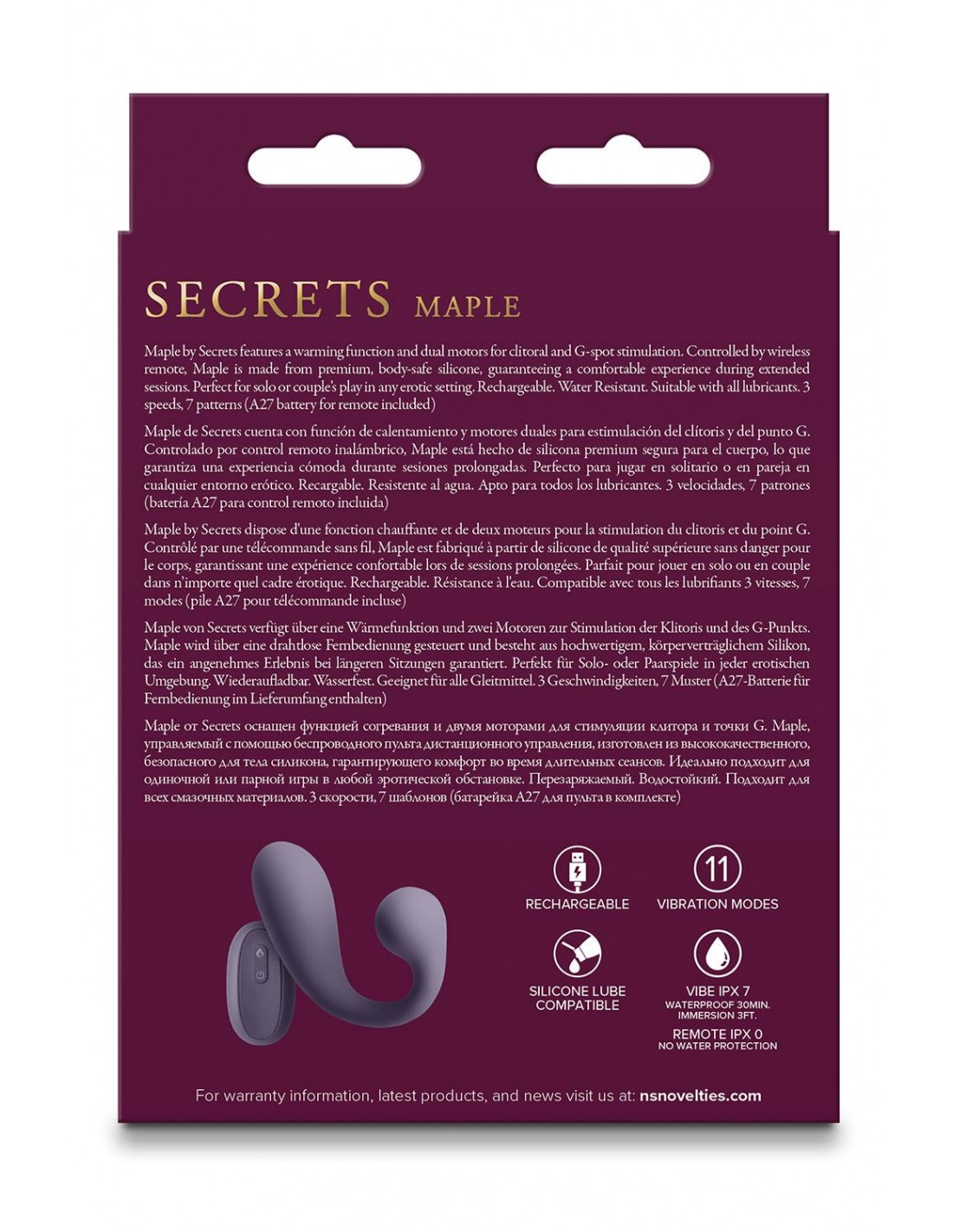 Maple by Secrets dispose d'une fonction chauffante et de deux moteurs pour la stimulation du clitoris et du point G. Contrôlé par une télécommande sans fil, Maple est fabriqué à partir de silicone de qualité supérieure sans danger pour le corps, garantissant une expérience confortable lors de sessions prolongées. Parfait pour jouer en solo ou en couple dans n'importe quel cadre érotique. Rechargeable. Résistant à l'eau. Convient à tous les lubrifiants. 3 vitesses, 7 modesPour jouer seul ou en coupleDimensions : 6,85 x 1,34 x 1,34 pouces / 17,4 x 3,4 x 3,4 cmDimensions insérables : 5,51 x 1,34 pouces / 14 x 3,4 cmMatériau : SiliconeRechargeablePile A27 pour télécommande incluseRésistant à l'eauConvient à tous les lubrifiants