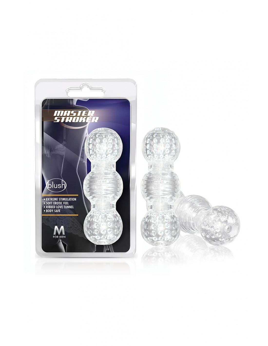 Rendez-le plus épais, plus long et plus fort avec le M for Men Master Stroker de Blush Novelties. Le masturbateur masculin extensible s'adapte à toutes les formes et tailles. Étape 1 : Stimuler, Étape 2 : insérer et Étape 3 : caresser. Répétez l'étape 3 pour une sortie érotique ! Chaque compartiment présente une texture individuelle pour une stimulation extrême. Caresser peut être un simulateur visuel pour vous ou votre partenaire. Regardez votre érection gonfler et pulser à l’intérieur des compartiments translucides. Master Stroker est fabriqué en élastomère sans phtalates et sans danger pour la peau. Il est facile à nettoyer avec un nettoyant pour jouets ou de l'eau et du savon, puis à sécher à l'air libre. 3 chambres avec des textures uniques pour une stimulation intense. La 1ère est doublée de picots stimulants doux pour masser votre tige. La 2ème chambre est nervurée pour augmenter la sensation de caresse. La 3ème chambre est également bordée de picots stimulants doux pour masser la tête de votre pénis, donnant ce peu de sensation supplémentaire pour vous envoyer par-dessus bord. paraffines ou latexOuvert pour s'adapter à toutes les longueurs de pénis. Format de pocheLongueur 6 pouces / 15,2 cmLargeur 2 pouces / 5 cm