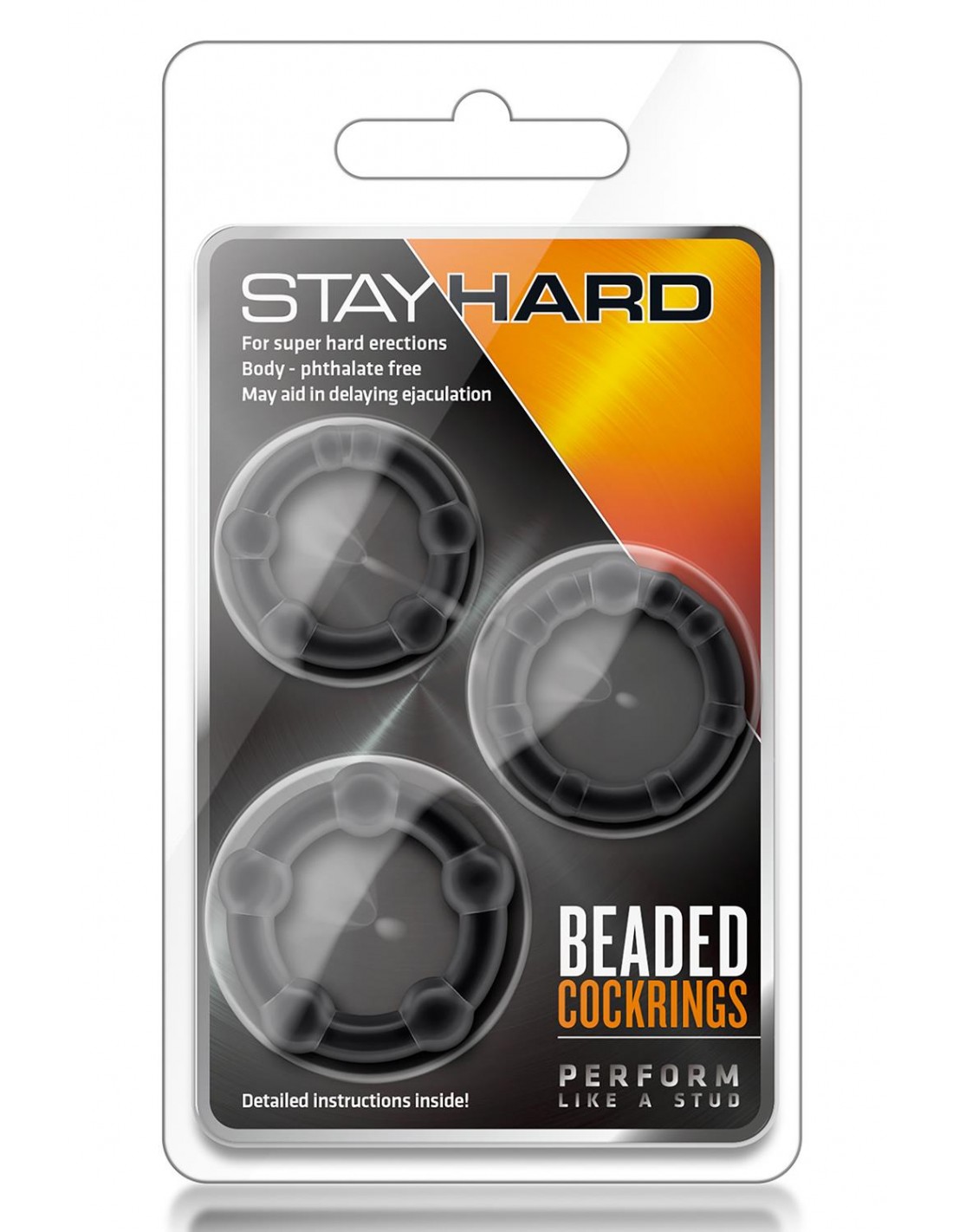 Soyez performant comme l'étalon que vous êtes ! Ces anneaux péniens à perles Stay Hard sont disponibles en 3 tailles, vous pouvez donc les utiliser individuellement ou les 3 à la fois. Le petit anneau est pour des érections maximales. L'anneau moyen est pour les érections dures. Le grand anneau peut être utilisé pour encercler la partie supérieure de votre scrotum pour aider à prévenir l'éjaculation prématurée. Ils sont fabriqués en TPE sans danger pour le corps, un matériau super extensible, confortable et sans phtalates développé spécifiquement pour votre sécurité et votre hygiène pendant vos jeux intimes. Donc, si vous cherchez un moyen sûr d'augmenter à la fois la taille et l'endurance, vous et votre partenaire êtes sûrs de profiter de l'anneau pénien Stay Hard Beaded de Blush Novelties et de votre érection plus grande et meilleure qui dure encore plus longtemps ! Lavez avec de l'eau et du savon entre les utilisations. Sécher à l'air libre. Se conserve mieux dans son emballage d'origine.3 tailles d'anneaux péniens perlésSuper élastique pour s'adapter à n'importe quel hommeSuper extensible, confortable et résistant aux déchiruresUtilisez-les individuellement ou 3 à la foisUn petit anneau pour des érections maximalesAnneau moyen pour des érections duresUn grand anneau peut être utilisé pour encercler la partie supérieure de votre scrotumAnneaux péniens polyvalents super extensibles qui peuvent s'étirer plus de 15 fois leur diamètre d'origine. Faites preuve de créativité ! Durable : fabriqué à partir de TPE à haute résistance à la traction, résistant à la déchirure Pour des érections plus fortes, plus dures et plus grandes Augmentez l'endurance 3 Tailles pour s'adapter à tout le monde : 1,25 pouce / 3,1 cm 1,3 pouce / 3,3 cm 1,5 pouce / 3,8 cm