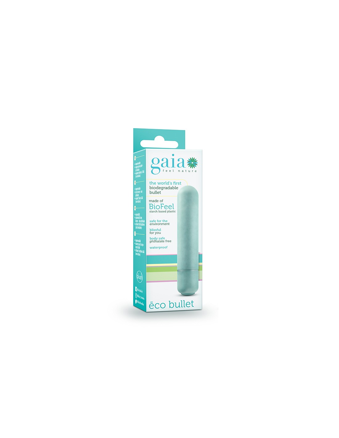 Cette petite ambiance pleine de plaisir est fabriquée à partir de Biofeel, un matériau à base de plantes. Profitez de vibrations silencieuses et puissantes à une vitesse contrôlées par un simple bouton-poussoir. Vous adorerez la puissance de cette balle lisse et serez rassuré en sachant que Gaia Eco Bullet utilise moins d'énergie et crée moins d'émissions de gaz à effet de serre que tout autre jouet sexuel sur le marché ! Cette adorable ambiance est disponible en trois couleurs. Il est étanche, amusant dans la baignoire et facile à nettoyer. Nécessite 1 pile AAA. Longueur 3,5 pouces / 8,8 cm Largeur 0,75 pouce / 1,9 cm1 Vitesse Fonctionnement par bouton-poussoir Biodégradable Testé IPX7 submersible étanche pour jouer dans le bain et nettoyage pratique Nécessite 1 pile AAA, non incluse Bioplastique sans phtalates, latex et sans parfum ðŸŒ±â™»ï¸ ðŸŒŽ Télécharger Gaia FAQQu'est-ce qui fait de Gaia un produit écologique et durable ?Gaia est la première collection de vibrateurs fabriqués de manière durable, fabriqués à partir des matériaux exclusifs de Blush BioFeelTM, un bioplastique à base de plantes sans pétrole, un composé polymère mélangé à un matériau à base de plantes, et BioTouchTM, un matériau en caoutchouc naturel avec une grande résistance à la traction et à la déchirure pour une durabilité durable. Les matériaux non pétroliers tels que le caoutchouc naturel et le bioplastique constituent un bien meilleur choix pour l’environnement que le caoutchouc synthétique ou le plastique. De plus, ces matériaux proviennent d'agriculteurs durables et responsables. Qu'est-ce que BioFeelTM ? BioFeelTM est le bioplastique végétal unique de Blush, un matériau composé de polymères mélangé à des matériaux d'origine végétale. Ce matériau est le choix parfait pour un vibromasseur car il est non poreux, ce qui le rend sans danger pour le corps et facile à nettoyer. Il ressemble et joue comme n'importe quel jouet en plastique dur. Le BioFeelTM de Blush est doux au toucher et est composé d'au moins 35 % de matières végétales durables sans pétrole (blé). D’autres fabricants utilisent du plastique 100 % à base de pétrole. En utilisant un matériau naturel à base de plantes, Blush crée moins de gaz à effet de serre. Cela rend nos produits plus durables et meilleurs pour l'environnement. Qu'est-ce que BioTouchTM ? BioTouchTM est la version exclusive du matériau en caoutchouc naturel de Blush. Il répond à des exigences mécaniques et chimiques strictes et est robuste, mais suffisamment souple pour les produits de plaisir. Il possède une résistance élevée à la traction et à la déchirure, garantissant que votre jouet tiendra la distance avec vous. BioTouchTM est non poreux, ce qui le rend sans danger pour le corps et facile à nettoyer. BioTouchTM est recouvert de notre Ultrasilk® exclusif à base de silicone pour une sensation de douceur satinée. Que signifie sans pétrole ? Les produits sans pétrole ne sont pas à base d'huile. La partie végétale du PLA est sans pétrole et notre caoutchouc naturel est sans pétrole. Que puis-je faire avec mon jouet une fois que j'en ai fini avec ? Votre vibrateur Gaia peut être démembré et des pièces spécifiques peuvent être emportées dans différentes installations de fabrication commerciales. Les batteries, le moteur et la coque doivent être séparés. En quoi le cordon de chargement est-il écologique ? Le cordon de chargement de Gaia est enveloppé dans du coton au lieu de plastique et possède une tête BioFeelTM au lieu d'une tête en plastique traditionnelle. En quoi le nouvel emballage est-il plus respectueux de l'environnement ? Le nouvel emballage de Gaia est fabriqué à partir de papier kraft sans taches UV ni papier d'aluminium, qui sont à base de pétrole et traités, ce qui rend le papier plus difficile à recycler. L'encre que nous utilisons sur notre nouvel emballage Gaia est une encre naturelle à base de soja ! Combien de temps faut-il à Gaia pour composter ? Dans des conditions de compostage, la coquille se compose en 2 à 3 ans environ. Gaia se désintégrera-t-elle dans le corps ? Les produits Gaia sont soumis à des tests tiers stricts et se sont avérés sans danger pour le corps. Quels sont les avantages d'acheter un produit Gaia par rapport à un autre produit ? Les produits Gaia sont plus durables et meilleurs pour notre planète. Parce qu'ils sont fabriqués à partir de matériaux d'origine végétale, la production des produits Gaia utilise moins d'énergie et crée moins de gaz à effet de serre. Les vibrations Gaia sont puissantes, de haute qualité et adorables !