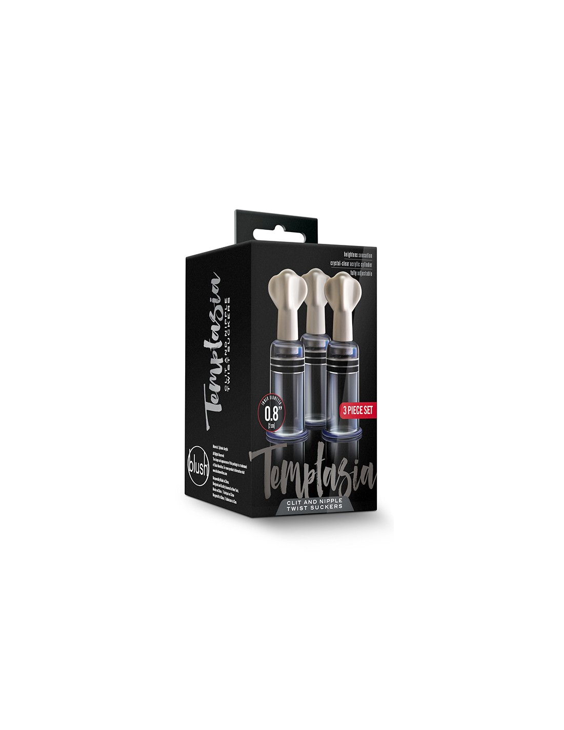 Les ventouses Temptasia Clit & Nipple Twist Suckers apportent un engorgement et une sensibilité accrue à vos zones les plus sensibles. Chaque cylindre cristallin procure un engorgement et augmente la sensation. Chaque cylindre d'aspiration de poche de cet ensemble triple est entièrement réglable. Les drageons n'ont pas besoin de pompe. L'aspiration se règle en tournant le haut. Placez le cylindre sur votre clitoris ou votre mamelon, puis tournez le haut pour l'ajuster. Les cylindres entièrement réglables vous permettent de jouer avec différents niveaux de plaisir. Plus vous tournez, plus vous créez de succion et de sensibilité. Lubrifiez l’ouverture du cylindre pour une aspiration et un confort accrus. Utilisez-en un, deux ou les trois en même temps ! Fabriqués en acrylique sans danger pour le corps, les ventouses Temptasia sont faciles à utiliser et à nettoyer. Ensemble de 3 cylindres d'aspiration pour stimuler les mamelons et le clitorisDiamètre intérieur 0,8 pouce / 2,0 cm