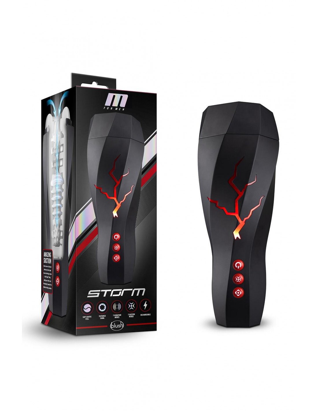 Le M for Men Storm est plein de plaisir ! Cette tasse de masturbateur nervurée contient une gamme de textures agréables qui massent et taquinent. Parcourez 7 fonctions de vibration puissantes et un effet d'aspiration à une touche qui resserre et relâche autour de vous pour un plaisir optimal. C'est comme si votre canne était bien traite. La coupelle interne est amovible pour un nettoyage facile et le capuchon peut être mis en place pour une protection et un rangement discret. Branchez les écouteurs inclus dans la prise casque et écoutez les gémissements réalistes ! Les masturbateurs M for Men sont doux, flexibles et remplis de textures sensationnelles. Fabriqué en TPE de qualité supérieure, Storm est sans danger pour le corps, sans parfum et sans phtalates. Construit pour durer. Comme pour tous les produits et/ou matériaux de Blush, il a été testé en laboratoire par un tiers pour respecter ou dépasser les directives de conformité de sécurité REACH et Prop65. C'est ton corps. Soyez conscient de ce que vous y mettez. L'effet de traite à une touche qui resserre et libère est incroyable ! 7 modes de vibrations et de pression pour une variété d'expériences. Gémissements érotiques réalistes et écouteurs inclus pour attirer vos fantasmes. USB rechargeable. Le manchon spongieux ultra doux est doublé de divers chatouilleurs pour intensifier l'orgasme. Amovible pour un nettoyage facile. 11,25 pouces / 28,5 cmLongueur insérable 5,5 pouces / 13,9 cmLargeur 4,25 pouces / 10,8 cm