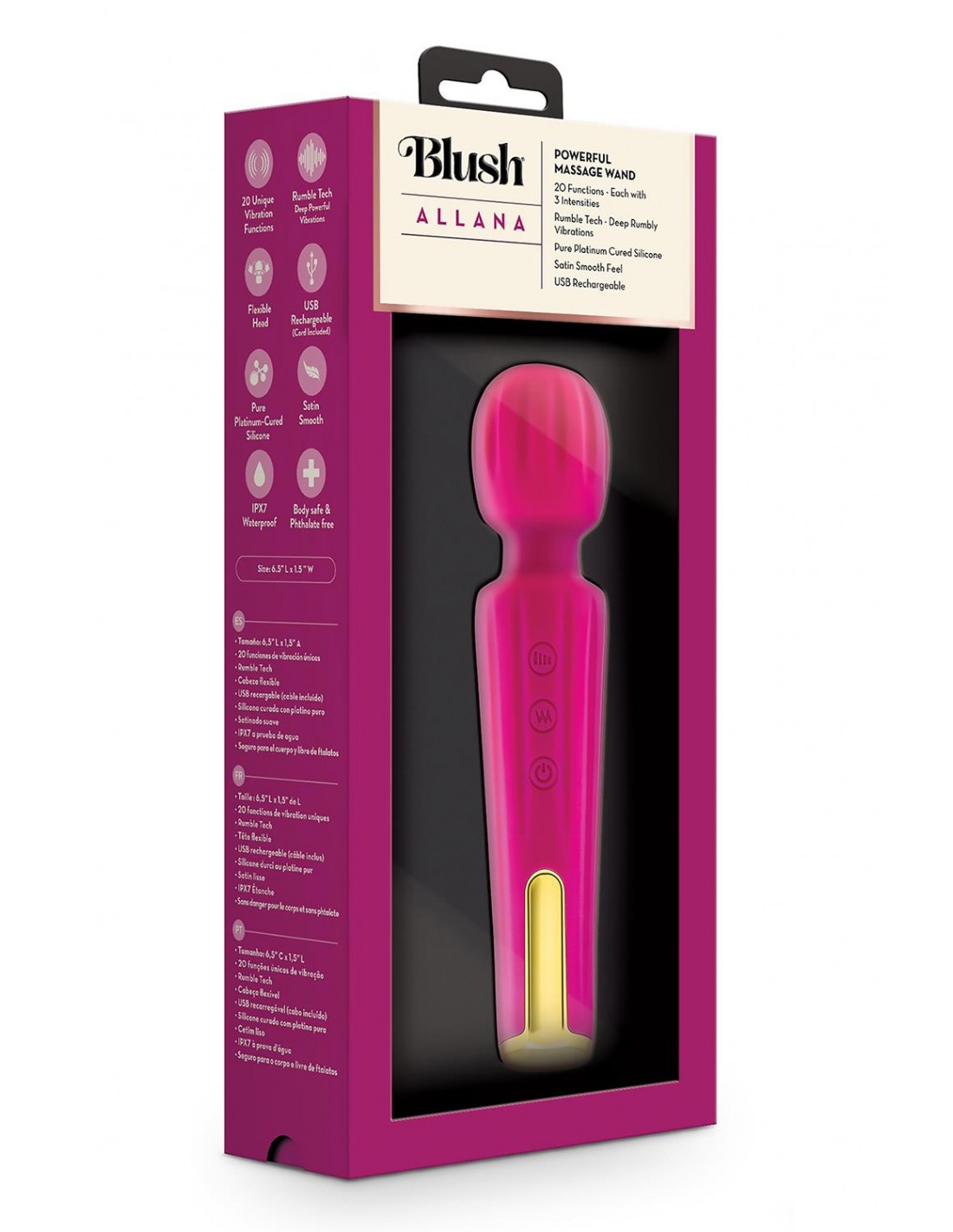 Blush Allana est une baguette puissante avec une tête flexible prête à ravir. Allana dispose de 20 fonctions de vibration profondes et grondantes et de 3 vitesses de vibration utilisant le puissant moteur RumboTech™ qui vous permettront d'explorer un large éventail d'options, toutes centrées sur vous. Allana est douce sur la peau et est parfaite pour le massage. Cette baguette rechargeable par USB est également étanche pour le plaisir du bain et de la douche ! Allana est fabriqué à partir de silicone lisse et satiné durci au platine et de plastique ABS. Allana est sans danger pour le corps, sans phtalates, sans parfum et facile à nettoyer.20 fonctions de vibration uniques3 vitesses de vibrationRumboTech™ Vibrations profondes alimentéesSilicone durci au platine doux et satinéToucher lisseRechargeable par USBImperméable submersible IPX7Longueur 6,5 pouces / 16,5 cmLargeur 1,5 pouces / 3,8 cmTemps de charge 3 heuresAutonomie 45 minutes