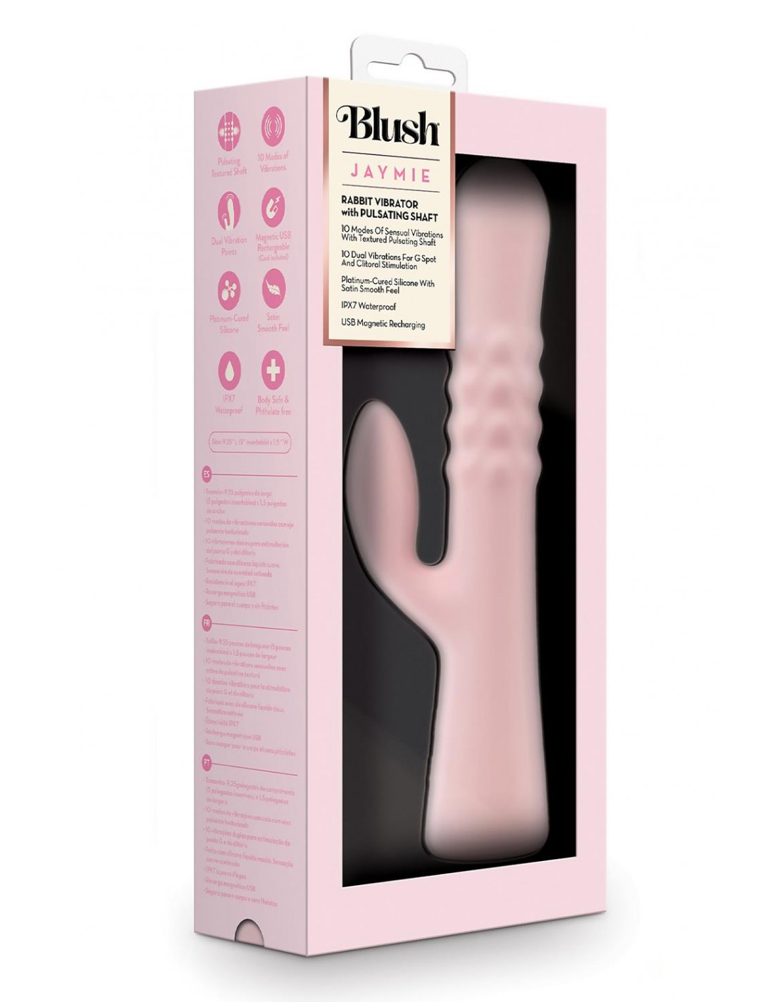 Continuez jusqu'à ce que vous atteigniez la cible avec Jaymie ! Ce vibromasseur énergétique est le lapin le plus polyvalent du marché, offrant tout à la fois un monde de sensations stimulantes du point G et du clitoris. Conçu pour votre satisfaction, Jaymie possède une tige lisse et texturée qui se dilate à chaque mode de vibration pulsée, vous apportant 10 sensations internes uniques qui feront courber vos orteils. Le stimulateur clitoridien rond a été conçu pour le confort, reposant doucement contre votre clitoris, offrant 10 sensations uniques qui complètent parfaitement les vibrations de la tige. Cela comprend 3 vitesses progressives et 7 modèles rythmiques parmi lesquels choisir, afin que vous puissiez personnaliser en toute transparence vos vibrations en fonction de vos envies. Fabriqué à partir de silicone durci au platine sans danger pour le corps, Jaymie est satiné et lisse sur votre peau, assurant un confort merveilleux pendant l'utilisation. Avec sa conception étanche IPX7 et sa recharge magnétique USB, il est prêt à vous accompagner sous la douche ou dans le bain pour un jeu amélioré. Jaymie est prêt à atteindre tous les bons endroits.10 modes de vibration sensuels avec tige pulsée texturée qui se dilate pour un plaisir interne10 doubles vibrations pour la stimulation du point G et du clitorisFabriqué à partir de silicone durci au platine avec une sensation lisse et satinéeRechargeable magnétique USBIPX7 étanche entièrement submersibleLongueur 9,25 pouces / 23,5 cmLongueur insérable 5 pouces / 12,7 cm Largeur 1,5 pouces / 3,8 cm