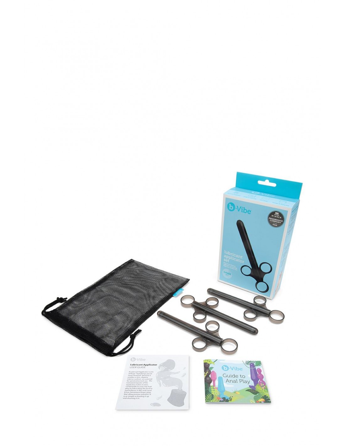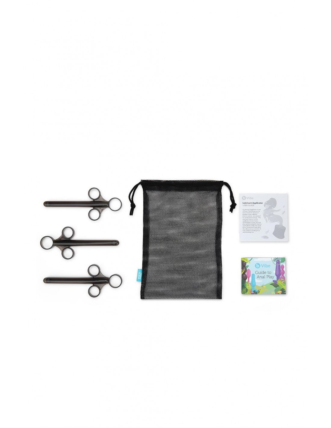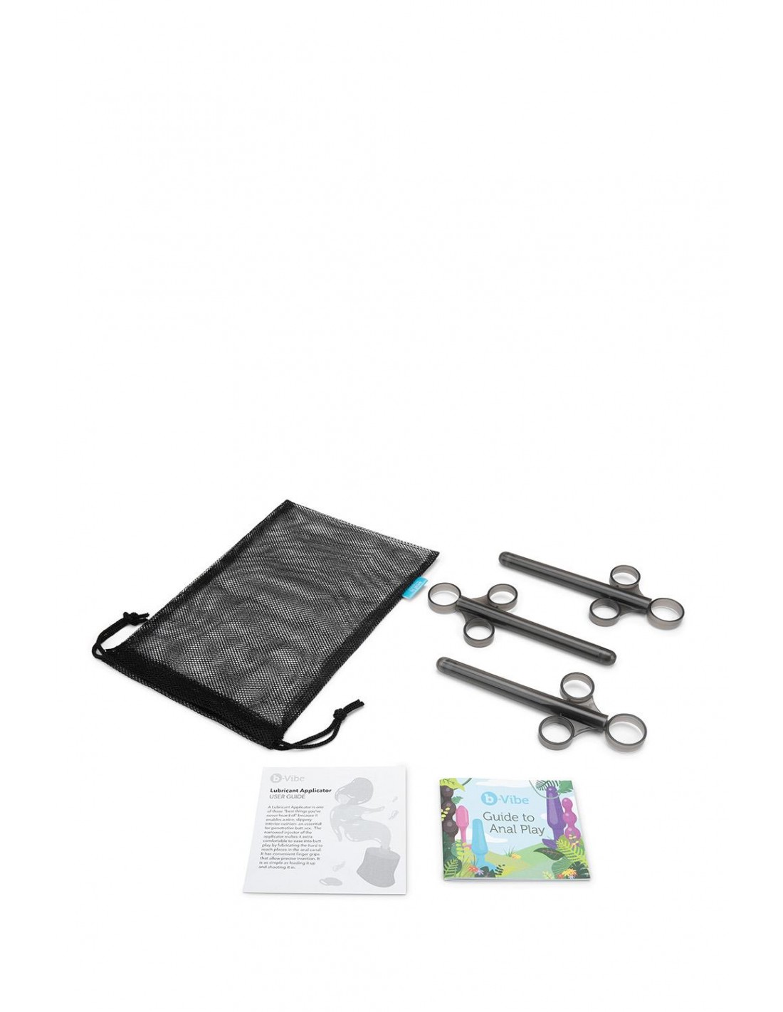 Ensemble d'applicateurs de lubrifiant b-Vibe - Ensemble de 3 applicateurs de lubrifiant pour une application précise de votre lubrifiant préféréComprend 3 applicateurs de lubrifiantSac de rangement et de séchageGuide du jeu analGuide de l'utilisateur L'applicateur de lubrifiant en paquet de 3 de b-Vibe permet une distribution complète de lubrifiant à l'intérieur du corps, particulièrement utile lors de la préparation d'un rapport sexuel avec pénétration. La pointe lisse glisse facilement pour une lubrification interne sans effort pendant les jeux anaux ou vaginaux. Chaque applicateur de lubrifiant est livré avec un capuchon amovible pour éviter les fuites.Dimensions de l'applicateur :Longueur totale 16,4 cmLargeur totale 6,8 cmLongueur insérable 9 cmb-Vibe : Produits de jeu anal haut de gamme pour tous les couplesb-Vibe est une collection haut de gamme de produits de jeu anal à la pointe de la technologie fondée par Alicia Sinclair, éducatrice sexuelle certifiée. Résultat d'années de recherche, chaque produit b-Vibe utilise des tactiques de conception innovantes pour répondre à des sources spécifiques, souvent non résolues, de plaisir anal. Pionnier dans la catégorie des accessoires anaux haut de gamme, b-Vibe a été en mesure de donner le ton de haute qualité, mais accessible, à une catégorie en pleine émergence. Plus particulièrement, la mission principale de b-Vibe est de permettre l'exploration par l'éducation. En proposant une gamme constante de contenus accessibles, des guides soigneusement rédigés et des informations du monde réel, la marque promeut l'inclusivité et le jeu éclairé. Tous les produits b-Vibe sont 100 % sans danger pour le corps, conformément à la California Prop 65 (sans phtalates) et aux certifications mondiales CE et REACH. Chaque prise est livrée avec une garantie et des livrets d'instructions pour rendre l'expérience plus sûre, plus informée et finalement plus agréable.
