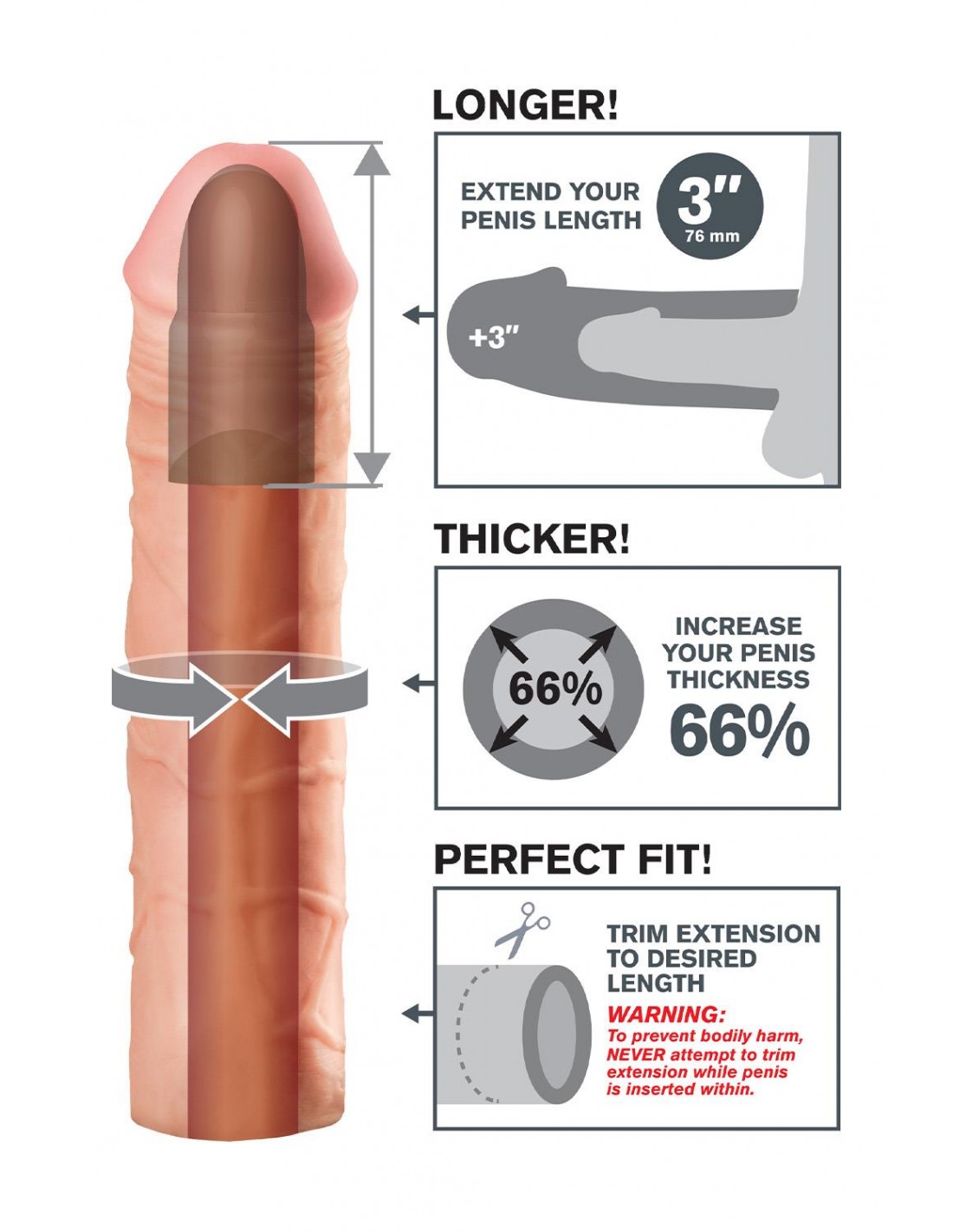 Transformez votre pénis en une machine à plaisir instantané avec les incroyables Fantasy X-tensions®. Vous pouvez désormais être tout l'homme que vous pouvez être et satisfaire votre partenaire avec ce stimulateur d'érection facile à utiliser. Développé comme une alternative sûre, abordable et non chirurgicale aux procédures médicales et aux pilules coûteuses, votre Fantasy X-tension® vous offrira la tige de plaisir la plus grosse, la plus épaisse et la plus satisfaisante que vous ayez jamais imaginée ! Parfait pour les hommes souffrant de dysfonction érectile et de problèmes de performances intermédiaires, votre nouvel activateur fournira des résultats que les deux partenaires adoreront ! L'extension Mega 3"" est une extension personnalisable qui peut être facilement coupée à la base pour un ajustement parfait. Il est super extensible pour s'adapter à la plupart des tailles et suffisamment ajusté pour vous aider à durer plus longtemps. Votre partenaire bénéficiera d'une pénétration plus profonde grâce à l'extension de 3" à la pointe, tandis que la tige ultra réaliste vous rend 66 % plus épais tout autour. Le matériau doux Fanta Flesh® ressemble à une seconde peau, vous donnant la longueur, la circonférence et la confiance dont vous avez besoin pour satisfaire votre amoureux.