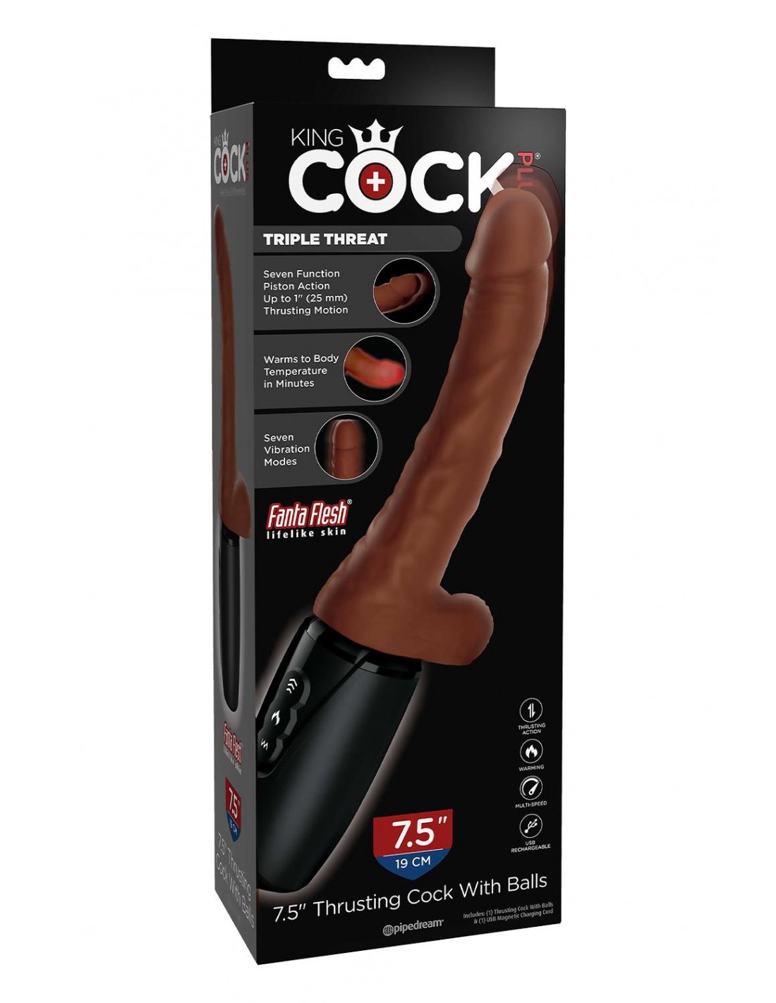 Sentez la différence ! Le King Cock® Plus Thrusting Cock With Balls est véritablement une triple menace qui comprend un mouvement de poussée profond alimenté par un piston de 1 pouce, un échauffement interne jusqu'à la température du corps en quelques minutes et de puissantes vibrations stimulantes pour une expérience ultime. Le plaisir de poussée est conçu pour être naturellement réactif, massant chacun de vos mouvements, rapides ou lents. La simple pression sur un bouton active les 7 fonctions uniques du moteur vibrant, qui est stratégiquement situé à la pointe du Thrusting Cock pour un plaisir précis à l'intérieur et à l'extérieur. Pour une stimulation optimale, des vibrations dynamiques combinées à une action de poussée réactive et un réchauffement interne créent des résultats orgasmiques explosifs à chaque fois !