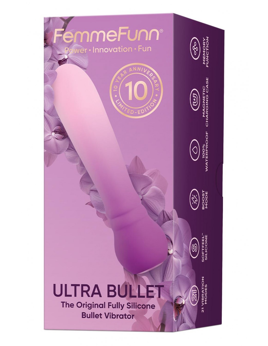Il y a dix ans, FemmeFunn a choqué le marché avec le lancement de l'Ultra Bullet, le tout premier vibromasseur à balle entièrement en silicone. La finition en silicone SOFTFEEL™ était une toute nouvelle expérience qui n'avait jamais été vue ou ressentie auparavant, et sa puissance inégalée en a fait un succès instantané. Pour célébrer le 10e anniversaire de l'Ultra Bullet, ils reviennent au début et donnent à leur OG une refonte à la manière de FemmeFunn - un dégradé d'orchidée en édition limitée (couleur Pantone de l'année en 2014), une charge rapide améliorée, un mode boost extra puissant et un étui de chargement magnétique chic qui tient dans votre sac pour une soirée parfaite. Plusieurs modes de vibration : FemmeFunn a ajouté un mode de vibration stable « extra-faible » pour 21 modes de vibration au total. L'Anniversary Ultra Bullet est conçu pour vous permettre de vous amuser comme bon vous semble. Utilisez-le pour stimuler votre clitoris, vos mamelons ou partout où vous aimeriez ressentir ces vibrations profondes et grondantes. Mode Boost amélioré : Non seulement un mode Boost a été ajouté, mais il a été rendu encore plus puissant ! Le boost amélioré dépasse désormais le réglage le plus élevé. Silicone SOFTFEEL™ : le silicone emblématique de FemmeFunn a la finition la plus douce. moteur silencieux. Il est également petit, ce qui est parfait pour les voyages. Charge rapide : dites adieu aux jours de manque de jus, cette petite ambiance se recharge en moins d'une heure ! Étui de chargement magnétique : L'étui en édition limitée sert également d'étui de chargement et de voyage, un véritable indispensable. Comment utiliser : Pour l'allumer ou l'éteindre, appuyez et maintenez le bouton FF pendant trois secondes. Appuyez une fois sur le bouton FF pour parcourir les différents modes de vibration. Double-cliquez sur le bouton FF pour activer le mode Boost. Important : Si en utilisant un lubrifiant, utilisez UNIQUEMENT un lubrifiant à base d'eau. N'utilisez pas de lubrifiants à base de silicone, d'huiles de massage, de crèmes pour les mains, de lotions ou de lubrifiants similaires sans base d'eau avec ce produit. durée : environ 1 heure. Remarque sur la durée d'exécution : les estimations de la durée de vie de la batterie ne sont que cela : des estimations. La durée de vie réelle de la batterie varie en fonction de la fréquence d'utilisation, de l'âge de la batterie, de la température de l'appareil, etc.