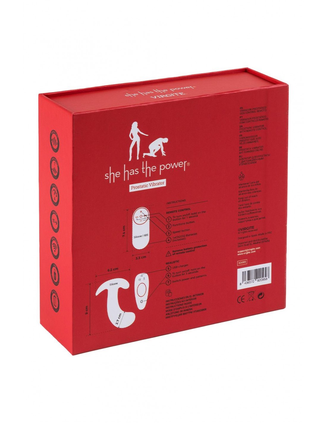 Virgite, objets érotiques, est une marque déposée et conçue en Espagne et fabriquée avec des matériaux de haute qualité. Il est composé de différentes gammes de produits qui seront élargies à tous les types de publics. Vous choisissez qui a le pouvoir : elle, lui ou les deux ? Jouet anal puissant en silicone très doux, adaptable aux parois anales. De plus, il est rechargeable via un câble USB et peut être contrôlé depuis sa télécommande avec une portée allant jusqu'à 10 mètres. Caractéristiques : Matériau : silicone lisse et soyeux. Il contient un moteur puissant à son extrémité pour profiter davantage des vibrations. 4 vitesses. 7 modes de vibrations. Avec télécommande. Portée de distance jusqu'à 10 mètres. Étanche. Rechargeable via câble USB. Mesures totales : 9 cm x 6'2 cm. Largeur insérable : 2,7 cm.